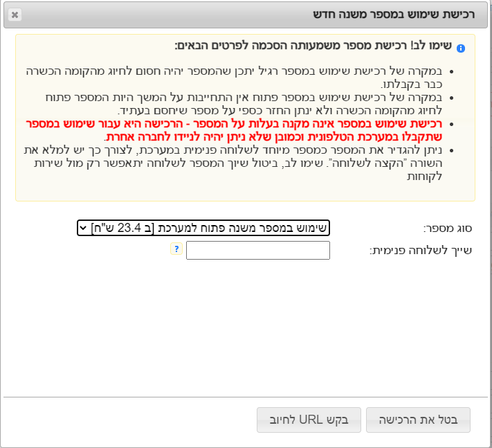 @השפן-הקטן אמר בפתחתי קו חדש ב-11 ש''ח ולא עובד בגולן: בשירות לקוחות הם מבהירים שלא ינתן החזר כספי על מספר שייחסם, אבל לא עד כדי כך. אבל כן מתחייבים שזה פתוח כרגע חוץ מזה שהמספר משנה הוא לא 100 אחוז בבעלותך אלא רק מעביר למערכת שלך או שולח ממנו צינתוקים ואפילו לשנות אותו כהגדרה אחרת אי אפשר, אז אל תשווה. (השורה הזאת היא אפילו לא שטויות...) מבחינת מה ששלך ומה לא גם מערכת רגילה וגם מספר משנה בדיוק אותו דבר לא שלך, ואפילו אם תקנה מספר בבזק ותנייד לימות המספר כבר לא שלך ואין כזה דבר שמספר משנה רק פנה למערכת שלך זה עוד מספר על המערכת בדיוק כמו המספר הראשי...