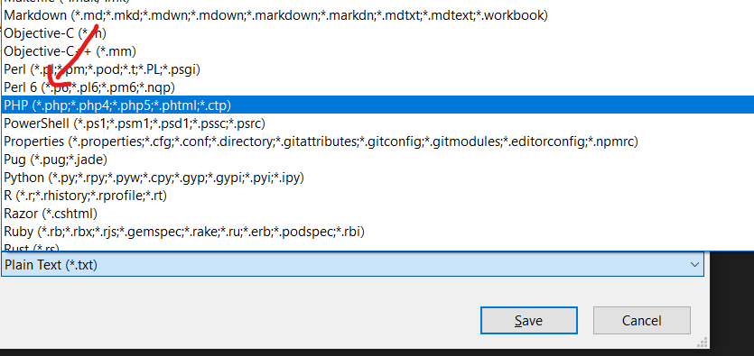 נבחר מתוך התפריט בשורה מתחת את שפת PHP: